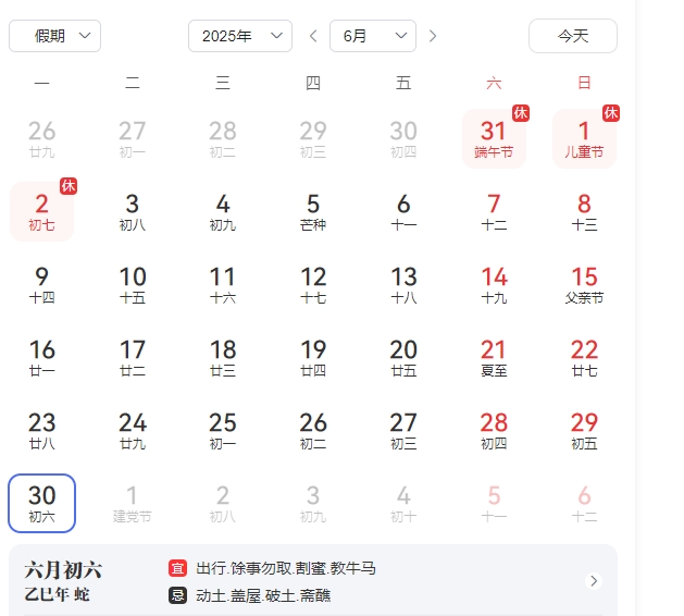 放假時(shí)間為 5 月 31 日(周六)至 6 月 2 日(周一),共計(jì) 3 天。6 月 2 日(星期一)為端午節(jié)法定節(jié)假日,5 月 31 日(星期六)、6 月 1 日(星期日)為正常公休日。